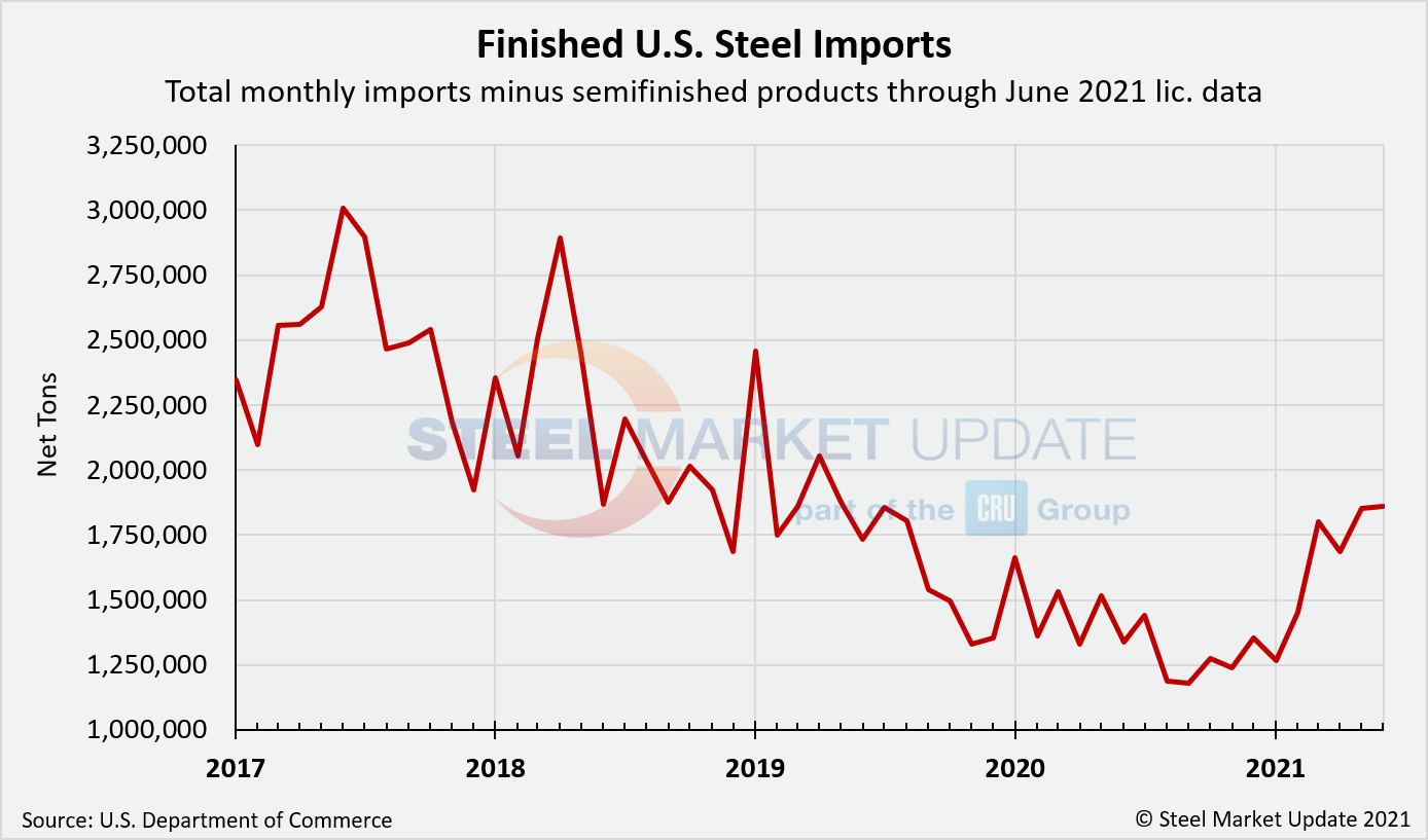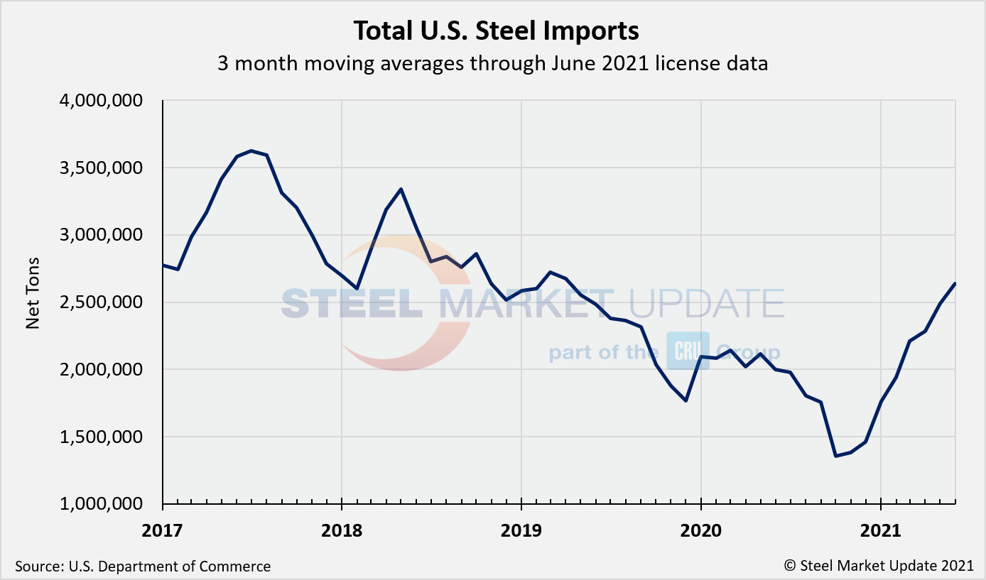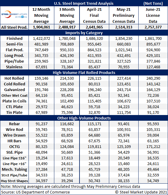 Due to large month-to-month swings in semifinished imports, the chart below shows total monthly imports on a three-month moving average (3MMA) basis in an attempt to more accurately display U.S. steel import trends. The 3MMA through preliminary May import data is 2.49 million tons, up from 2.28 million tons in April and up from 2.21 million tons in March. The lowest 3MMA level in our recent history was October 2020 at 1.36 million tons. The May 3MMA is now the highest seen since May 2019. Looking into the current license data, the June 3MMA would be even higher at 2.64 million tons, which would be the highest level seen since April 2019.