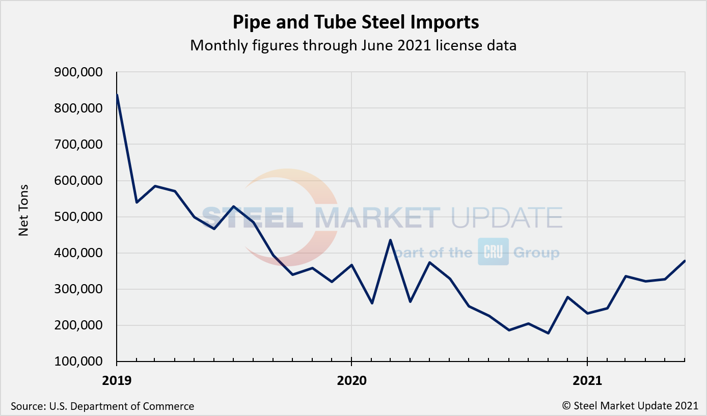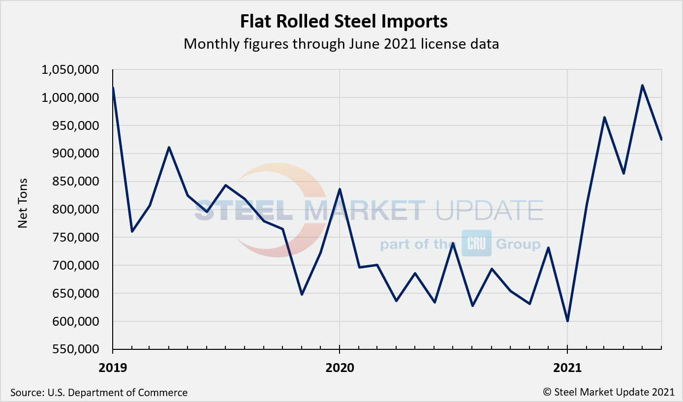 The two charts below show monthly imports grouped by product category: flat rolled imports and pipe and tube imports. Flat rolled imports surged to a multi-year high in May to 1.02 million tons, with the latest June licenses at 925,000 tons. Pipe and tube imports rebounded to 328,000 tons in May, and June licenses appear to be up as well at 378,000 tons (the 2020 high was 436,000 tons in March).
