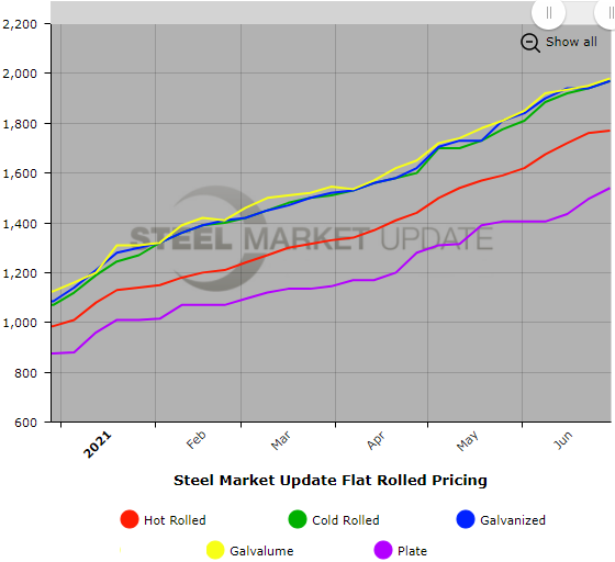 SMU Note: Below is a graphic showing our hot rolled, cold rolled, galvanized, Galvalume and plate price history. This data is available here on our website with our interactive pricing tool. If you need help navigating the website or need to know your login information, contact us at info@SteelMarketUpdate.com.