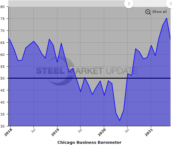Below is a graph showing the history of the Chicago Business Barometer. You will need to view the graph on our website to use its interactive features; you can do so by clicking here. If you need assistance logging into or navigating the website, please contact us at info@SteelMarketUpdate.com.