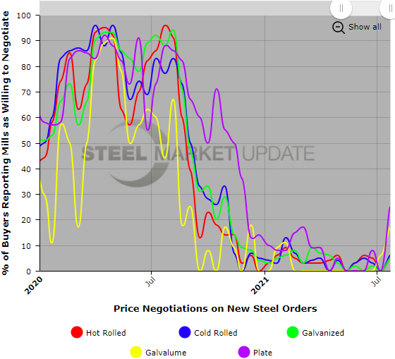 There’s nothing new to report on the climate in steel price negotiations. All but a tiny percentage of respondents to this week’s survey confirmed that the mills still feel no need to talk price when they can sell all the spot tons they have for a huge premium. “The mills are not even negotiating what tons we can get, let alone pricing. They definitely have the upper hand,” said one buyer. “There’s no negotiation, and that has been the case throughout this runup, especially on cold rolled and galvanized,” said another.