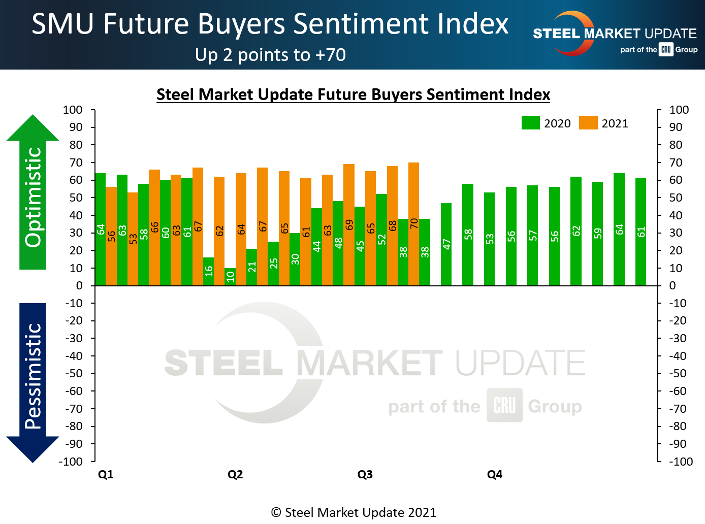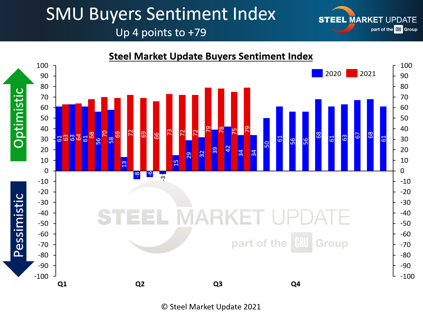 Steel Market Update’s survey of steel buyers this week shows no signs of anxiety about a possible price correction in the coming months. Like steel prices, buyers’ attitudes have never been loftier. SMU’s Steel Buyers Sentiment Index moved up four points to tie its all-time high of +79 as steel prices continued to rise and mills and service centers reported record second-quarter earnings. SMU’s Future Sentiment Index was nearly as optimistic, up two points to +70.