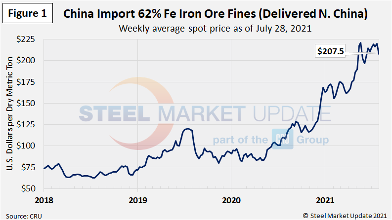 The Chinese import price of 62% Fe content iron ore fines has been moving upward for over a year, since May 2020. Figure 1 shows the price of 62% Fe delivered North China at $207.5/dmt as of July 28, up 11% over three months prior and nearly double the July 2020 price.