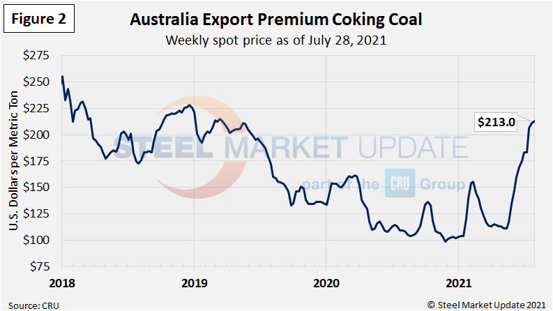 The price of premium low volatile coking coal FOB east coast of Australia has ramped up since May, surpassing the 2020 high last month and reaching $213.0 per dry metric ton as of July 28 (Figure 2). The last time coking coal prices were this high was in March 2019. Although up over 2020 levels, recent coking coal prices are just now approaching levels seen from approximately 2017 to mid-2019.