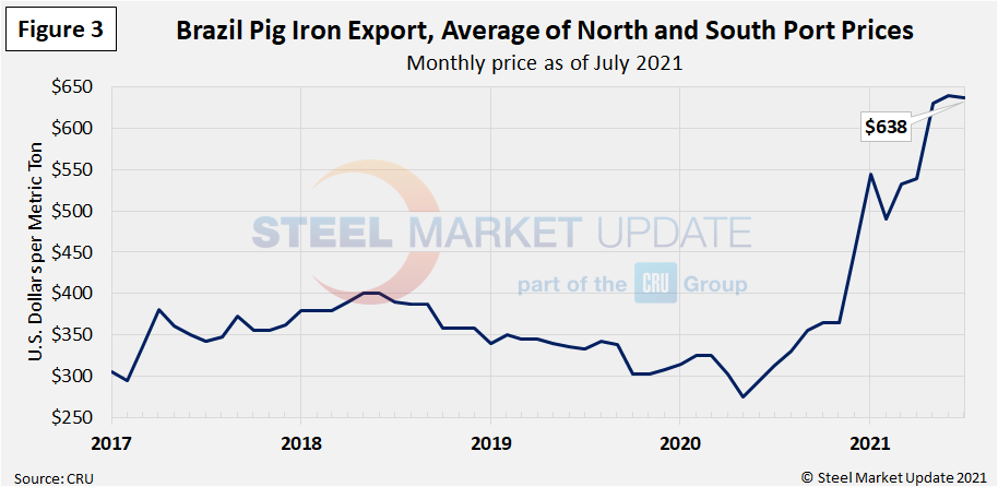 Most of the pig iron imported to the U.S. currently comes from Russia, Ukraine and Brazil. This report summarizes prices out of Brazil and averages the FOB value from the north and south ports. The latest data through July shows an average pig iron price of $638 per metric ton. Pig iron prices have remained historically high for the past eight months and are up 104% from levels one year ago. Pig iron prices reached a low of $275 per metric ton in May 2020, with prices increasing each month thereafter through January 2021. After February’s slight dip, pig iron prices resumed their upward climb and have remained strong since (Figure 3).