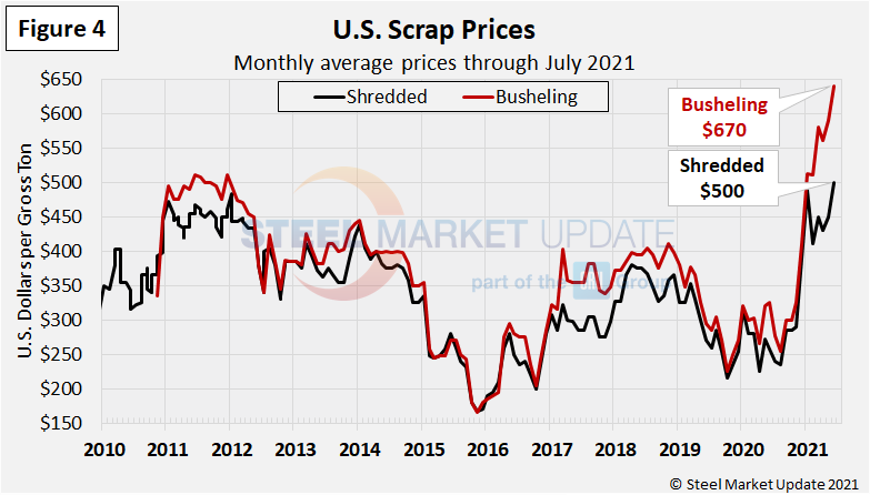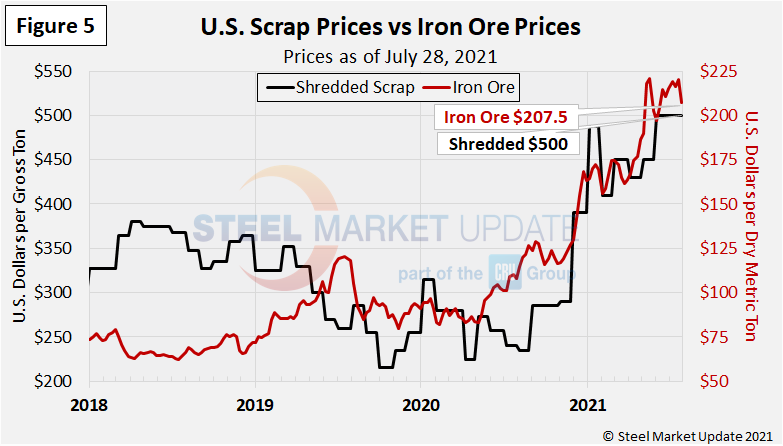 Figure 5 shows the similar uptrend in the prices of mill raw materials over the past year as the price of iron ore surpassed $200 per dry metric ton in May. Shredded scrap reached $500 per gross ton in June and has remained at that level since.