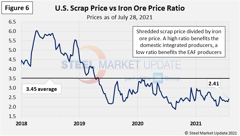 To compare the two, Steel Market Update divides the shredded scrap price by the iron ore price to calculate a ratio (Figure 6). A high ratio favors the integrated/BF producers, a lower ratio favors the minimill/EAF producers. At the current 2.41 ratio shown below, minimills continue to hold a cost advantage. This ratio hit an all-time low of 1.86 in August 2020 (within SMU’s 12-year limited data history).