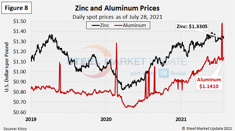 Zinc, used to make galvanized and other products, has been on the rise since March 2020 and reached a multi-year high in early-June (Figure 8). The LME cash price for zinc as of July 28 is $1.3305 per pound, down 4% from the June 2 peak of $1.3883. The latest zinc price is up 2% from three months prior, up 32% from one year ago, and up 62% from the March 2020 low of $0.8236. The price of zinc factors into the coating extras charged by the mills for galvanized products.
