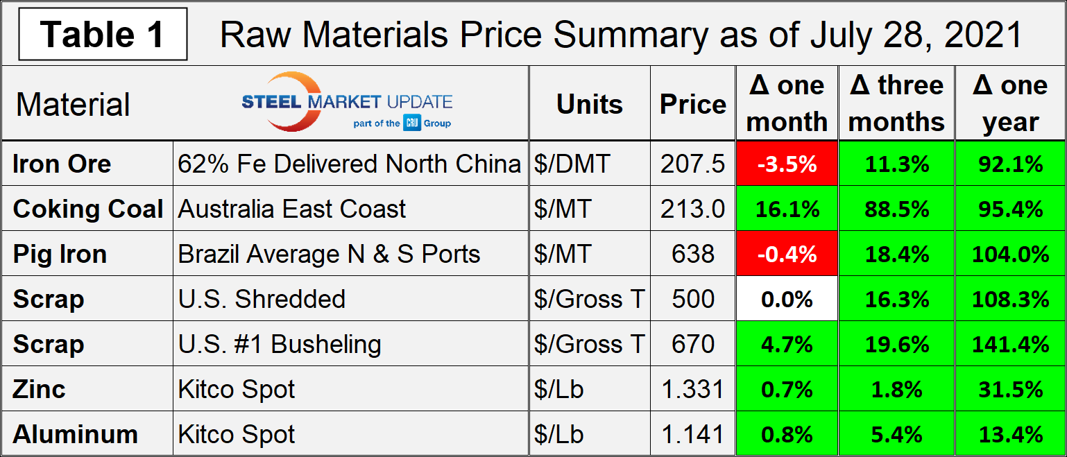 Prices for four of the seven steelmaking raw materials tracked in this SMU analysis increased from June to July, with all products following large gains in previous months. Over the last 30 days, coking coal prices increased 16% and busheling scrap prices rose 5%. Zinc and aluminum prices increased less than 1%, while shredded scrap remained flat and pig iron prices declined slightly. Iron ore prices declined 3.5% from late June to today.