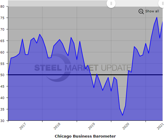 Below is a graph showing the history of the Chicago Business Barometer. You will need to view the graph on our website to use its interactive features; you can do so by clicking here. If you need assistance logging into or navigating the website, please contact us at info@SteelMarketUpdate.com.