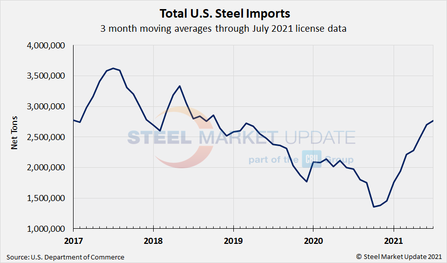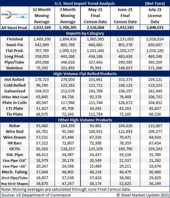 Due to large month-to-month swings in semifinished imports, the chart below shows total monthly imports on a three-month moving average (3MMA) basis in an attempt to more accurately display U.S. steel import trends. The 3MMA through final June data is 2.70 million tons, up from 2.49 million tons in May and up from 2.28 million tons in April. The lowest 3MMA level in our recent history was October 2020 at 1.36 million tons. The June 3MMA is the highest level seen since March 2019 when 3MMA imports were 2.72 million tons. Looking at July license data, the July 3MMA is currently at 2.77 million tons, which could potentially be the highest level since October 2018’s 2.86 million ton rate.