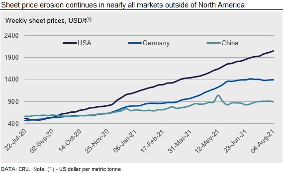 In the domestic Indian market, demand remains subdued due to seasonal weakness. Restocking cycle for major manufacturers is likely to resume in late-August, until which point spot trade may remain under pressure. However, automakers reported an impressive growth in July 2021 sales, which may encourage them to increase output (thus consuming more sheet), but a possible semiconductor shortage for the remainder of the year may still dampen demand.