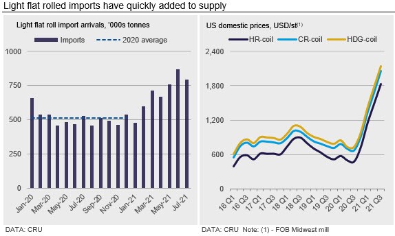 These price spreads have continued to widen, even as higher levels of light flat rolled import arrivals have come in. The latest data suggest that over the past three months, May through July, light flat rolled imports have averaged 800,000 t, which is 34% higher than what arrived in 2021 Q1. Buyers have clearly turned to the import market to secure needed supply.