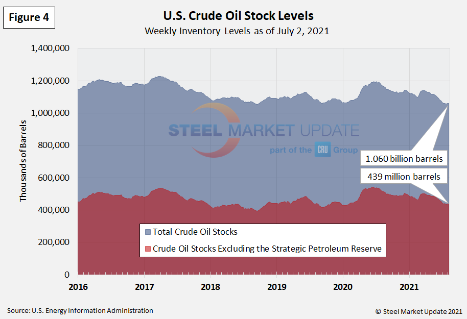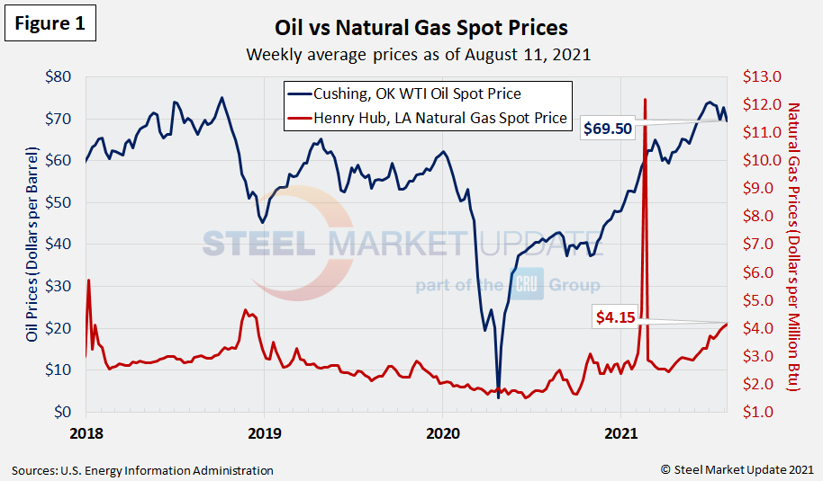 The spot market price for West Texas Intermediate (WTI) has declined from July’s peak, now at $69.50 per barrel as of Aug. 11. The July 2, 2021, weekly average of $74.07 was is the highest weekly oil spot price average since October 2018, a 33-month high. Natural gas prices at the Henry Hub in Oklahoma continue to rise, now at $4.15 per MMBTU (million British Thermal Units) as of Aug. 11. Excluding the February 2021 surge (when winter storms impacted much of the nation and the scarcity of natural gas and rising demand drove spot prices through the roof), this is the highest weekly oil spot price average since Dec. 14, 2018, when it was $4.38 per MMBTU. Figure 1 shows the weekly average spot prices for each product.