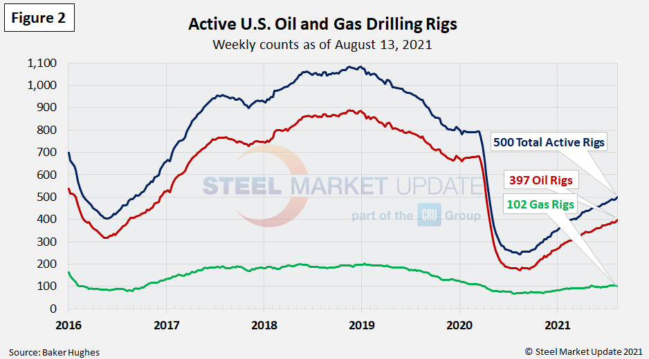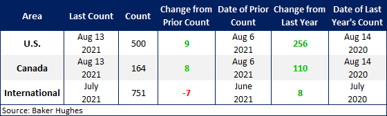 The number of active U.S. oil and gas drill rigs continues to recover since the mid-2020 low. The count was 500 active drill rigs as of the end of last week. That total is comprised of 397 oil rigs and 102 gas rigs, according to the latest data from Baker Hughes (Figure 2). While up over recent months, active drill rigs are still down 37% from 793 rigs in March 2020, just prior to the coronavirus shutdowns. The table below compares the current U.S., Canadian and international rig counts to historical levels.
