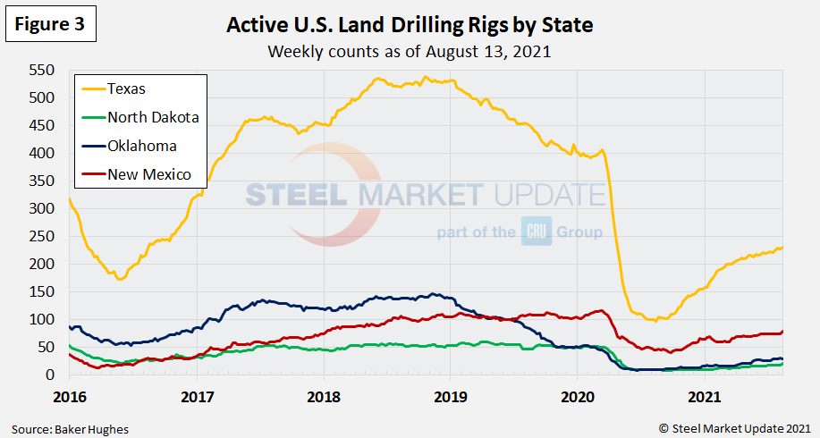 U.S. oil and gas production are heavily concentrated in Texas, Oklahoma, North Dakota and New Mexico, which have seen declines of 35-65% since March of last year. The most active state, Texas, now has 231 active rigs in operation, the highest level seen since April 17, 2020. Texas rigs had plummeted from 407 in March 2020 to 97 rigs in August 2020 (Figure 3).