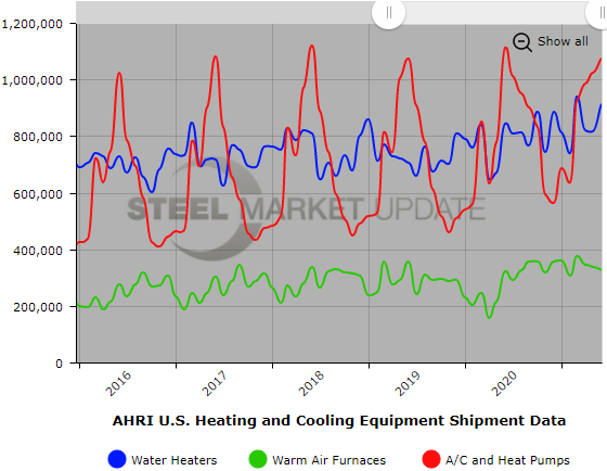 Below is a graph showing the history of total water heater, warm air furnace and air conditioner shipments through the latest data. To use its interactive features, view the graph on our website by clicking here. For assistance with either logging in or navigating the website, contact Info@SteelMarketUpdate.com.