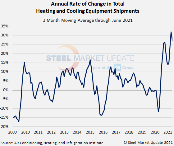 As a three-month moving average (3MMA), total heating and cooling shipments rose 27.2% year over year, the second highest rate seen in SMU’s 12-year history. May 2021 holds the record high 3MMA annual rate of change at 31.9%, and the record high prior to 2020 was 16.6% in February 2015. As shown in the chart below, June marks the 12th consecutive month that 3MMA shipments have increased on a year-over-year basis.