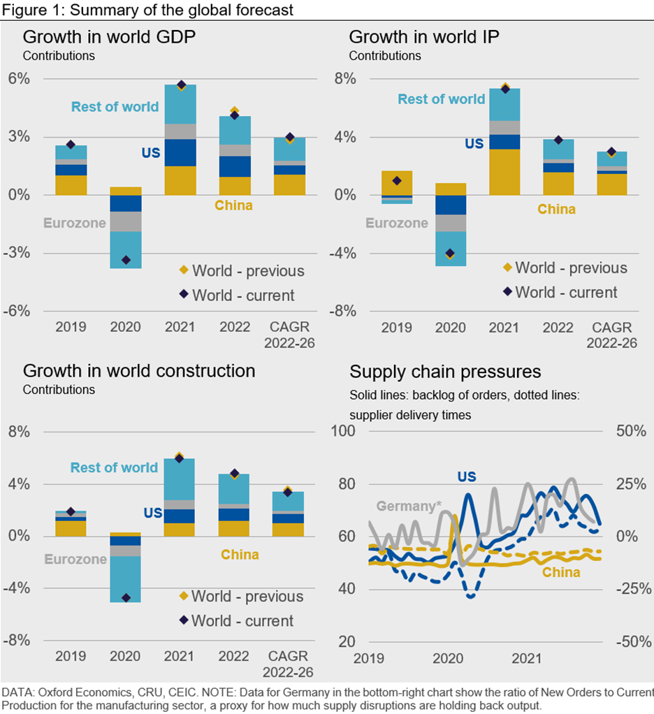 • We have marginally revised up our forecast for 2022 growth in world industrial production (IP) from 3.8% to 3.9%, and for construction from 4.7% to 4.8%.