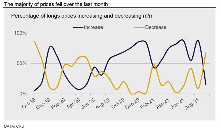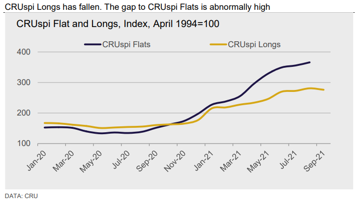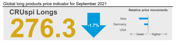 Overall, the Global Long Products Price Indicator (CRUspi Longs) fell by 1.7% m/m to 276.3 in September 2021. Price falls were assessed in Europe and Asia. U.S. rebar and structural prices were stable, but wire rod increased.