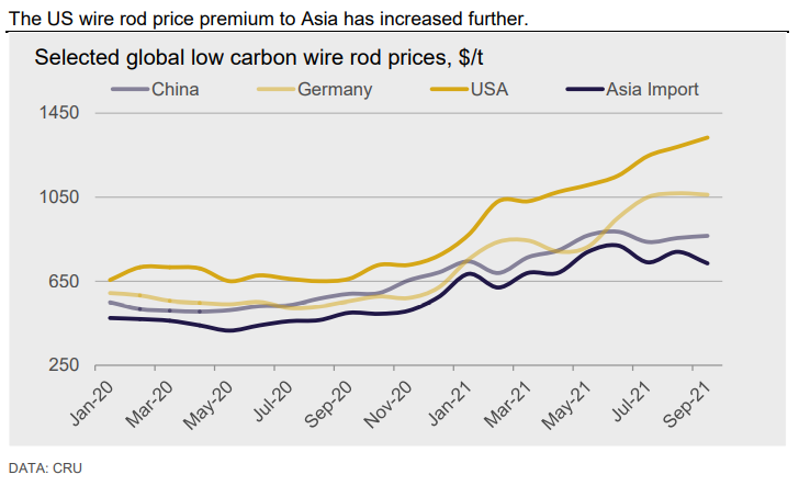 The USA remains the strongest market and wire rod remains the strongest product: U.S. wire rod prices are now $600 /t higher than those in Asia. German prices are also significantly higher than those in Asia, although the premium is half that of the U.S. market.