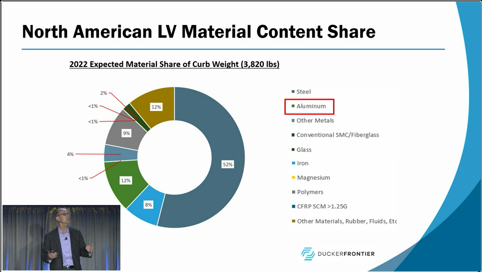 Steering the presentation towards vehicle design, Catterall said it is important that the EV battery structure is protected from any impacts or compression from an accident, which is best accomplished using very high-strength steel. Namely martensitic grades, press hardened steel grades, and now third-generation high-strength austenite grades. Using steel “gives engineers a lot of latitude” says Catterall, compared to other materials such as aluminum or composites. Steel continues to account for a large percentage (52%) of the material content in light-vehicles, according to the below chart.