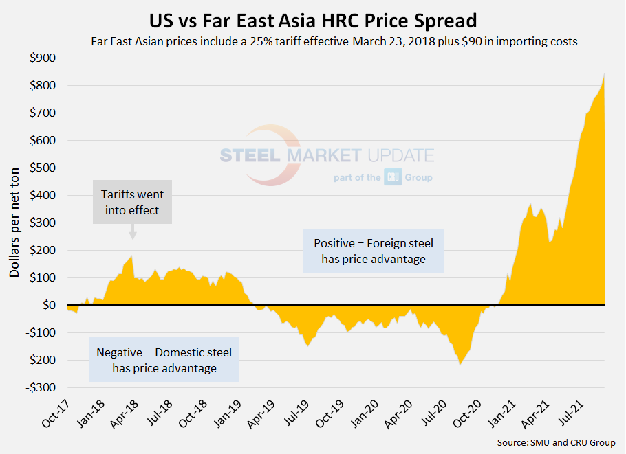 As of Wednesday, Sept. 1, the CRU Far East Asian HRC price declined $18 per ton to $798 per net ton ($880 per metric ton), down $36 from two weeks prior. Adding tariffs and import costs, the delivered price of Far East Asian HRC to the U.S. is $1,088 per ton. The latest SMU hot rolled price average is $1,935 per ton, up $20 over the previous two weeks. Therefore, U.S.-produced HRC theoretically is now $847 per ton more expensive than imported Far East Asian HRC, up from $804 last week, and up from $782 two weeks ago. This is now the largest theoretical spread between Far East Asian and domestic HRC prices in SMU’s four-year history (we have seen a new record spread each of the last 15 weeks). Prior to 2021, the previous record high was $183 per ton in March 2018.