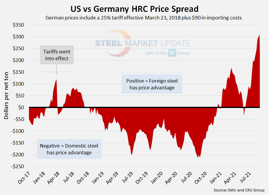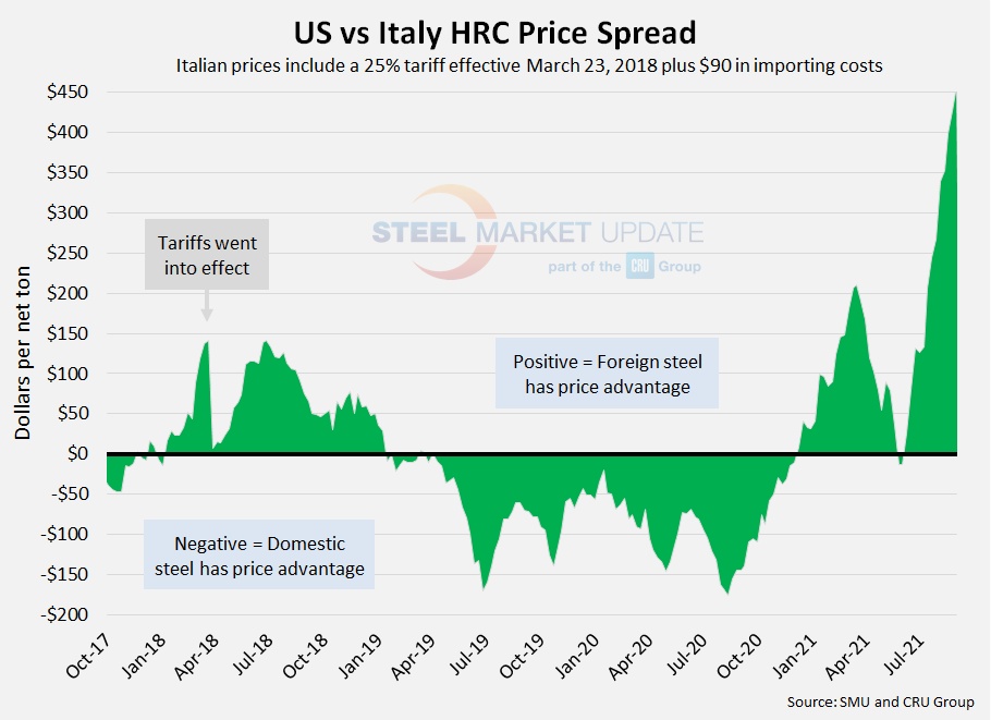 As domestic hot rolled steel prices surpass $1,900 per ton, foreign steel imports continue to tempt U.S. buyers, according to Steel Market Update’s latest foreign versus domestic hot rolled steel price comparison. While domestic prices rise week after week, foreign prices have remained steady or declined, holding potential discounts of 16% to 44% after taking freight costs, trader margins and tariffs into consideration. Current foreign HRC prices are theoretically $315-850 per ton cheaper than domestic steel prices. The spread between domestic and foreign prices has surged since late-May, surpassing the record levels seen earlier this year.