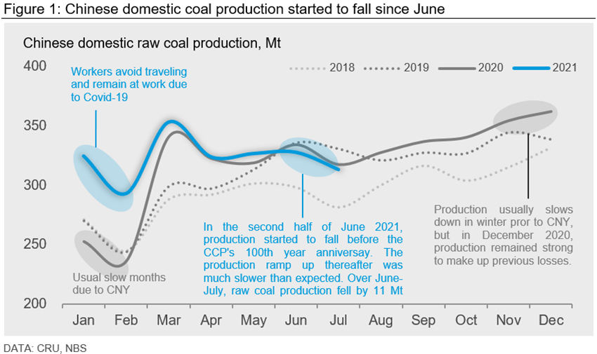 Following a few severe coal mine accidents early this year, the Chinese government started to conduct safety checks on coal mines and strictly prohibited overproduction. In particular, many coal mines across the country were asked to reduce output prior to the celebration of the 100th anniversary of the Chinese Communist Party (CCP) in early July to reduce the risk of accidents. Despite some recovery after the government’s event ended, coal mine production remained below the levels seen in previous years. According to official data, raw coal production, which includes both metallurgical and thermal coal, fell by 11 Mt y/y over June–July.