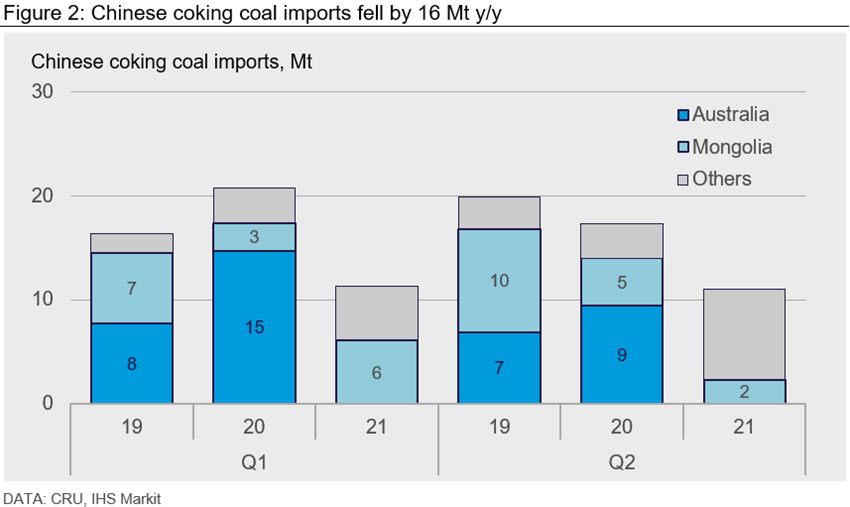 Chinese domestic coking coal production has been weak, and coking coal imports have also disappointed, falling by 16 Mt y/y in 2021 H1: