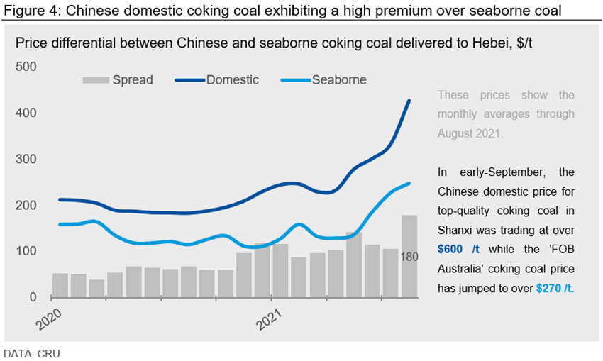 The fall in raw coal output was small relative to the production in those months, but the supply tightness of coking coal was exacerbated by coal mines that produce both thermal and coking coal prioritizing thermal coal to ease power shortages in the country. Meanwhile, more logistics capacity was allocated to thermal coal transportation for the same reason.