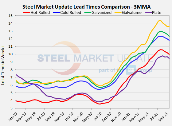 Cold rolled lead times moved down to 11.00 weeks from 11.67 in the same period. Galvanized lead times dipped to 11.22 weeks from 11.67 weeks. The average Galvalume lead time was basically unchanged at 13.43 weeks.