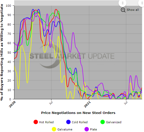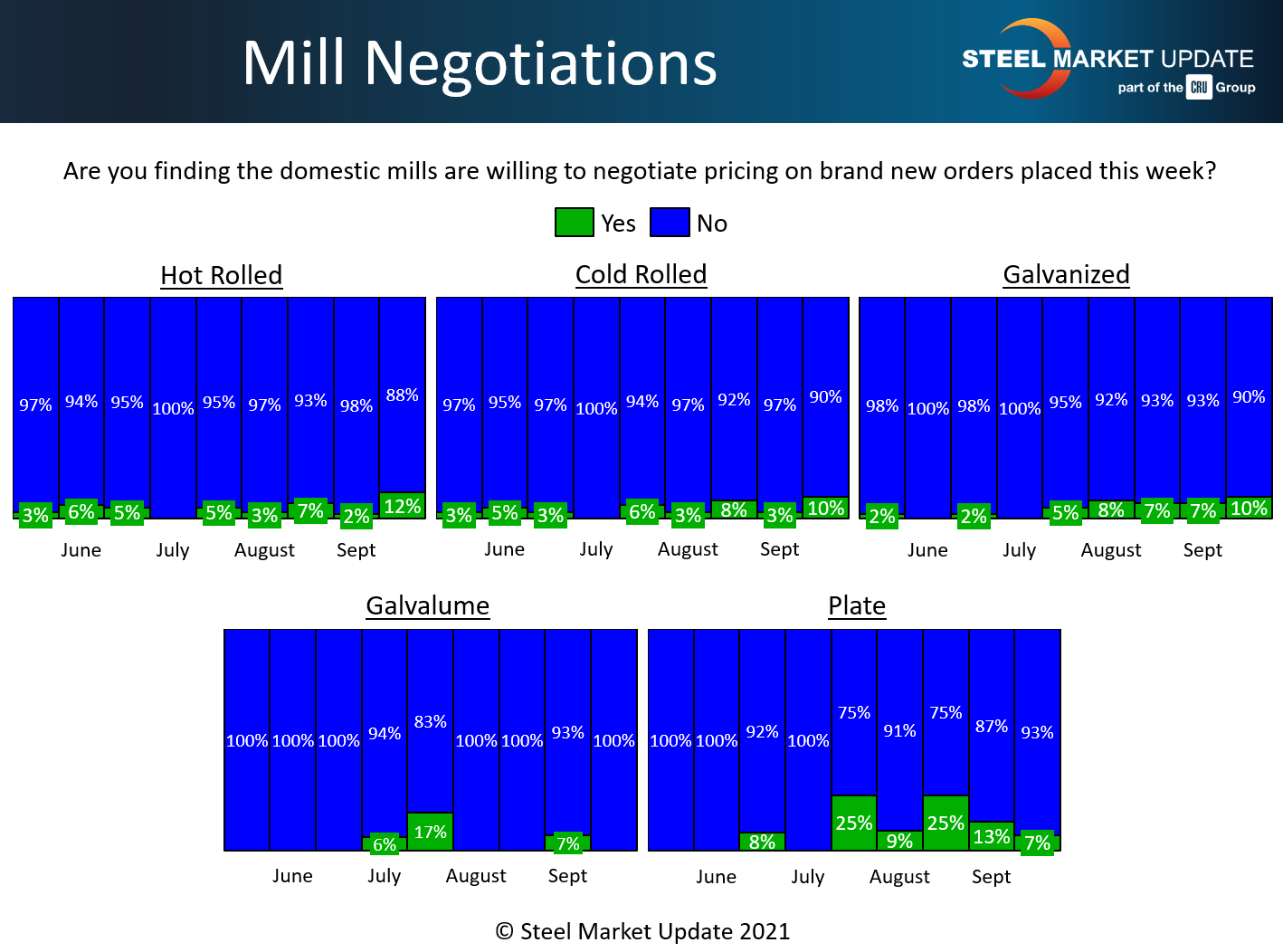 While the mills definitely still have the upper hand in price negotiations, buyers may finally be gaining some leverage. SMU asks buyers every two weeks if the mills are willing to talk price on spot orders. The percentage of hot rolled buyers answering “yes” has been in the single digits since November 2020, meaning more than 90% of the time the mills “just say no.” That is until this week when 12% indicated that some mills are now willing to consider discounts to secure HR orders. Cold rolled and galvanized have seen a similar shift, with 10% now reporting mills being more flexible on price. While subtle, this change in the tone of negotiations may reflect mills’ shrinking lead times and growing competition from imports.