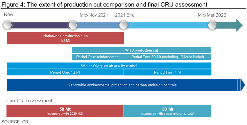 - Period One starts from mid-November to end-December, requiring related cities to finish their annual reduction in crude steel production. Because this period overlaps with the nationwide production cut policy in 2021, Period One can also be considered as a reinforcement measure for the nationwide policy.