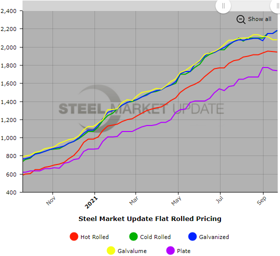 SMU Note: Below is a graphic showing our hot rolled, cold rolled, galvanized, Galvalume, and plate price history. This data is available here on our website with our interactive pricing tool. If you need help navigating the website or need to know your login information, contact us at info@SteelMarketUpdate.com.