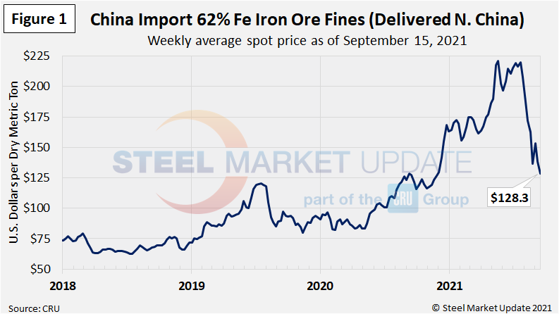The Chinese import price of 62% Fe content iron ore fines had been soaring upward for over a year, but began to slip in early-August. Figure 1 shows the price of 62% Fe delivered North China at $128.3/dmt as of Sept. 15, the lowest price seen since November 2020. Iron ore prices have fallen 21% in the last 30 days, down 40% compared to three months ago and almost equal to the price this time last year.