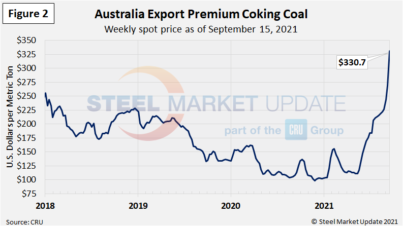 The price of premium low volatile coking coal FOB east coast of Australia has surged over the last four months, reaching $330.7 per dry metric ton as of Sept. 15 (Figure 2). Prices are up 49% in the last 30 days, up 95% in the past three months, and up a whopping 193% over levels one year prior. The last time coking coal prices were this high was more than 10 years ago, going back to early-2011.