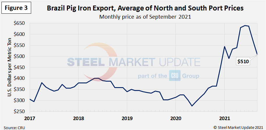 Most of the pig iron imported to the U.S. currently comes from Russia, Ukraine and Brazil. This report summarizes prices out of Brazil and averages the FOB value from the north and south ports. The latest data shows pig iron prices have declined 20% from the June/July peak, now averaging $510 per metric ton in September. Although down over the summer months, pig iron prices have remained historically high for the past 10 months and are up 43% from levels one year ago. Recall that pig iron prices had reached a muli-year low of $275 per metric ton in May 2020, with prices increasing each month thereafter through January 2021 (Figure 3).