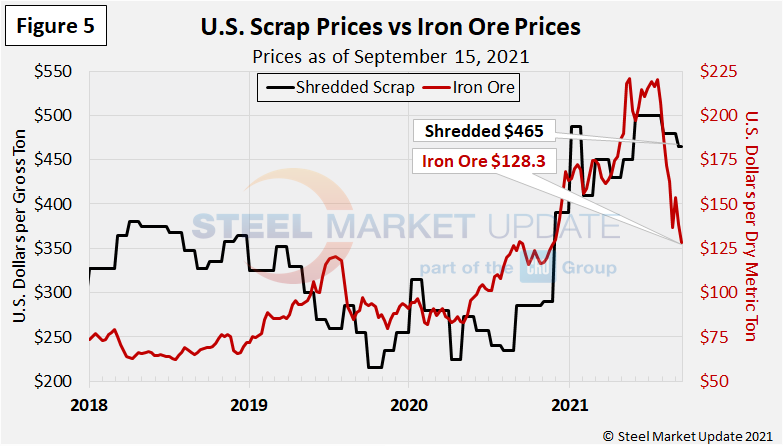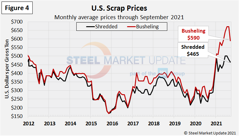 Figure 5 shows the prices of mill raw materials over the past four years. The price of iron ore has declined 42% from the mid-May 2020 peak of $221 per dry metric ton. Shredded scrap eased 3% from August to September, down 7% from the June/July peak.