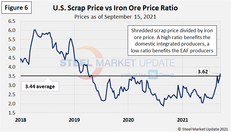 To compare the two, Steel Market Update divides the shredded scrap price by the iron ore price to calculate a ratio (Figure 6). A high ratio favors the integrated/BF producers, a lower ratio favors the minimill/EAF producers. At the current 3.62 ratio shown below, the cost advantage formerly held by minimills is lessening, surpassing the four-year average ratio line in black. This ratio reached it’s lowest point of 1.86 in August 2020 (within SMU’s 12-year limited data history).