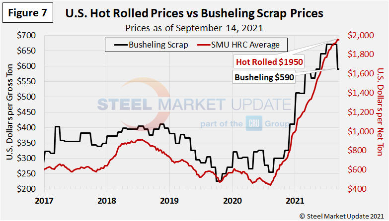 Figure 7 shows how the price of hot rolled steel generally tracks with the price of busheling scrap. Bush was down 12% from August to September, up $78 from the beginning of the year and up $280 from one year ago. The SMU hot rolled price average declined last week for the first time in more than a year, with the latest average down $5 to $1,950 per ton as of Sept. 14; this is up $35 per ton over the prior month, up $940 per ton since the start of the year, and up $1,370 per ton over one year ago.