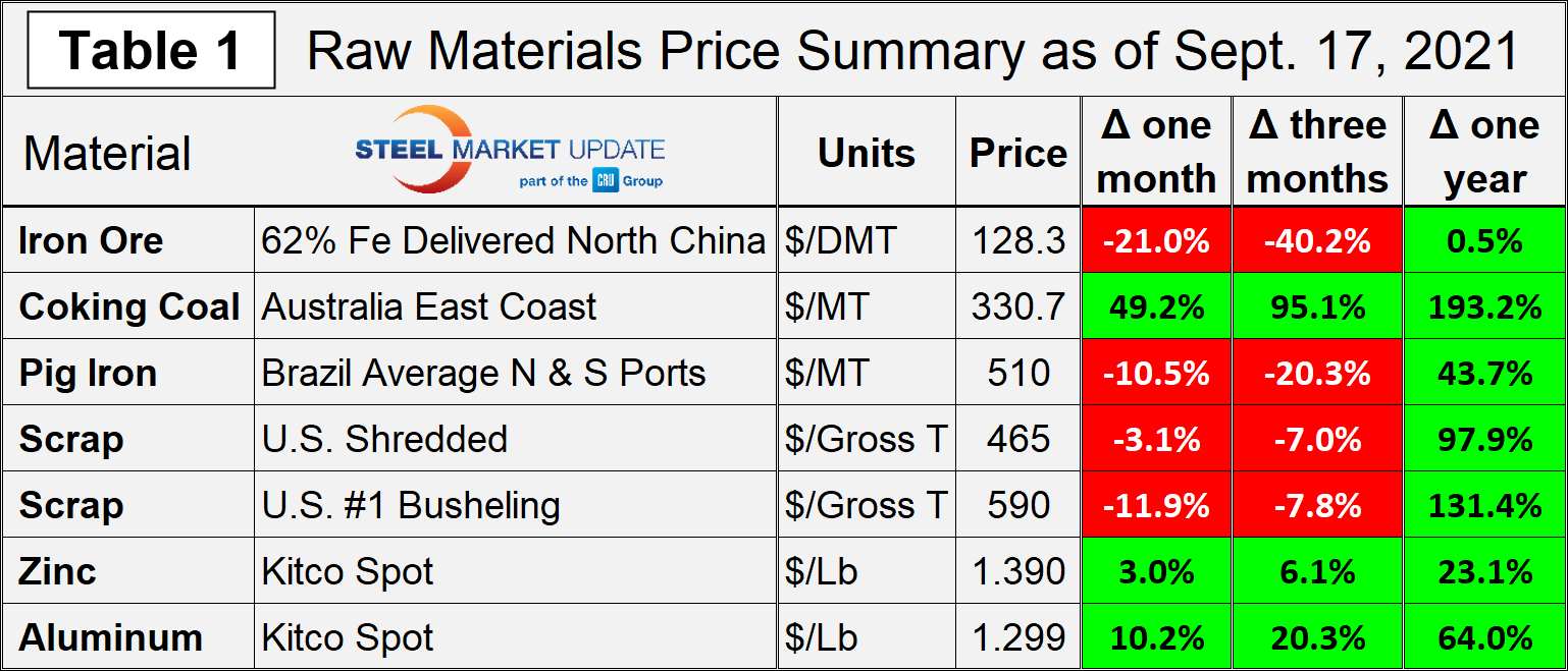 Prices for four of the seven steelmaking raw materials tracked in this SMU analysis decreased over the last 30 days. Through Sept. 17, iron ore prices stumbled 21% in one month’s time, busheling scrap prices declined 12%, pig iron prices fell 11%, and shredded scrap prices declined 3%. Coking coal prices jumped 49% in that same time frame, while aluminum prices rose 10% and zinc prices increased 3%.