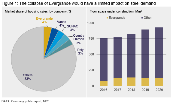 While the direct effect of the Evergrande crisis on the Chinese steel market is restricted, we believe construction steel demand in China will remain weak in the coming years. This is due to policies that have progressively tightened controls on financial liquidity and land supply in the housing market. We expect all these policies will remain in place despite the Evergrande crisis.