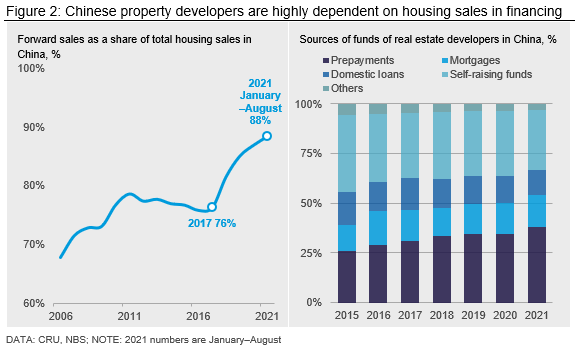 Due to the controls placed on debt financing, property developers have adopted a “high turn-over mode” since 2018. This approach meant developers increased sales of properties ahead of a majority of construction being completed, generally once only 20% of the project is finished. The revenue from the pre-sale and relevant prepayment and mortgage become the major financing support for the remainder of the construction activities. Forward sales already accounted for two-thirds of the property market, though from 2018 onwards this has risen sharply to nearly 90% this year.