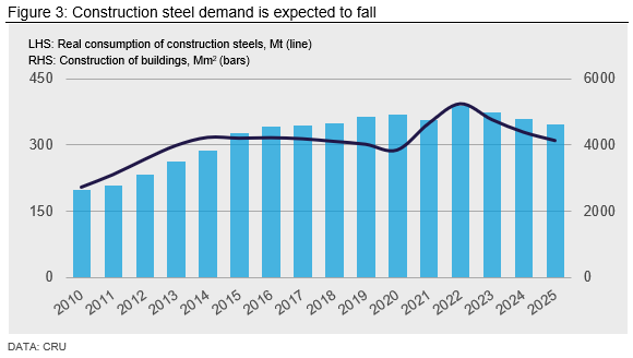 Given the real estate sector has already weakened this year, we expect steel demand from residential construction will continue to decline and we maintain a bearish outlook in the years ahead. In the short-term, the crisis may lead to buyers requiring faster completion of housing projects, which would provide some support for steel demand.