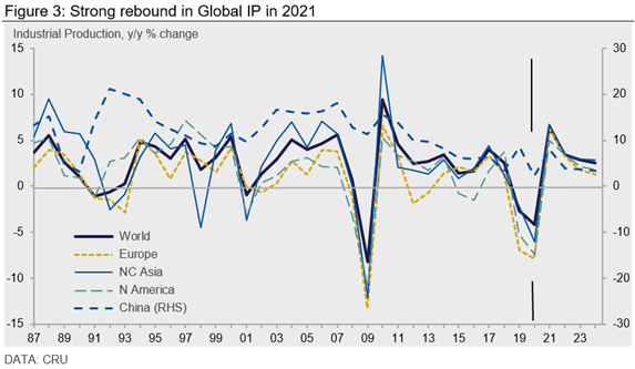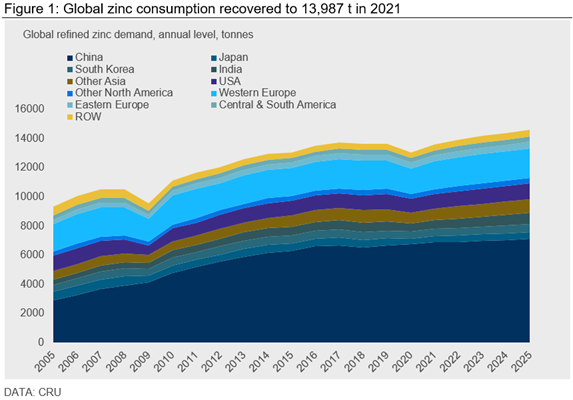 Economic stimulus packages and vaccination campaigns globally in 2021 have led to a global rebound, and IP is expected to grow by 8% following last year’s contraction of 4.2%. As a result, global zinc demand has not only recovered 2020’s losses but also grown relative to 2019, to 14 Mt.