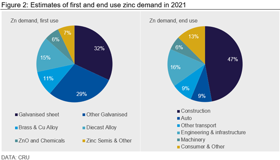 Construction forms the biggest end-use sector for zinc demand and is expected to account for about 6.6 Mt of the global total in 2021.The proportion of zinc consumed on an end-use basis has remained relatively stable historically, and we expect this trend to continue. However, automotive production has been in decline since 2017 due to tighter emissions regulations in major producing countries and more recently due to supply chain disruptions from Covid-19. This has resulted in a decrease in its share of global zinc demand from 11% in 2017 to 9% in 2021.