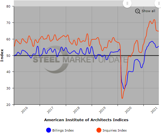 Below is a graph showing the history of the AIA Architecture Billings Index. You will need to view the graph on our website to use its interactive features; you can do so by clicking here. If you need assistance logging into or navigating the website, please contact us at info@SteelMarketUpdate.com.