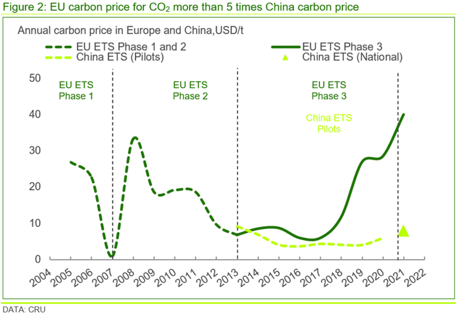 Opinions are divided over future CO2 prices. A China Carbon Pricing Survey conducted by China Carbon Forum in 2020 – 2020-CCPS-EN.pdf (chinacarbon.info) – suggested that average CO2 prices would rise towards RMB93 /tCO2 (i.e. $14 /tCO2) by 2030 and RMB167 /tCO2 (i.e. $26 /tCO2) by 2050. CRU research suggests that these carbon prices would be insufficient to make any real impact on decarbonisation. Put differently, if carbon allowances are reduced to make any tangible impact on decarbonisation levels, the CO2 price would increase significantly as a result.