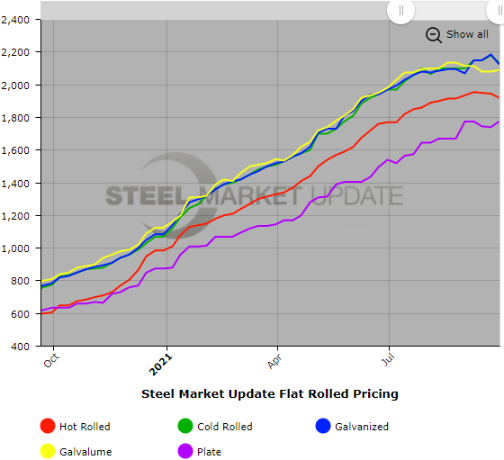SMU Note: Below is a graphic showing our hot rolled, cold rolled, galvanized, Galvalume, and plate price history. This data is available here on our website with our interactive pricing tool. If you need help navigating the website or need to know your login information, contact us at info@SteelMarketUpdate.com.